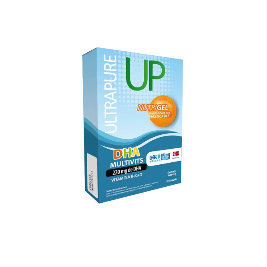 Omega UP DHA Multivits, 30 un., Newscience. Cada gel masticable de Omega UP DHA Multivits aporta 220mg de DHA más vitaminas A, B3, B6, B12, C , D3, E, biotina, yodo y ácido fólico. No contiene azúcar y es 100% natural.