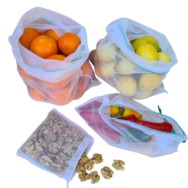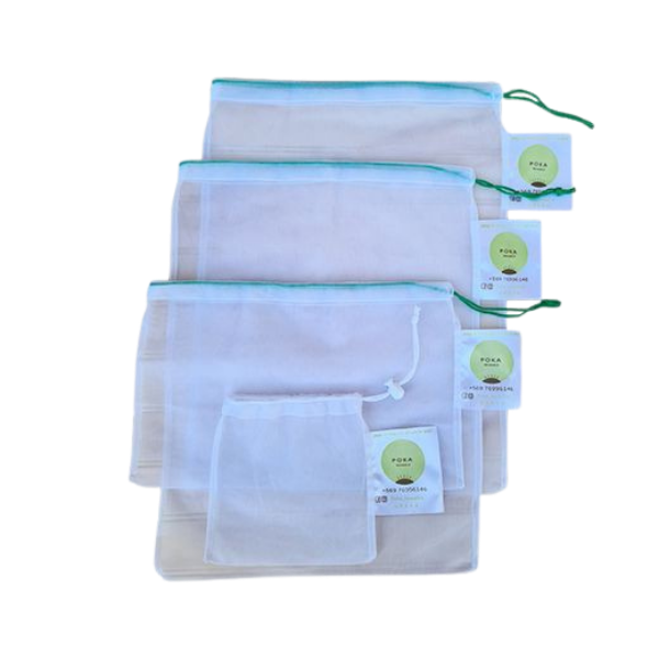Pack de 4 bolsas reusables de material reciclado de botellas PET en diferentes formatos. Ultra- resistentes, lavables, 100% reciclables. Únicas con etiqueta para precio.