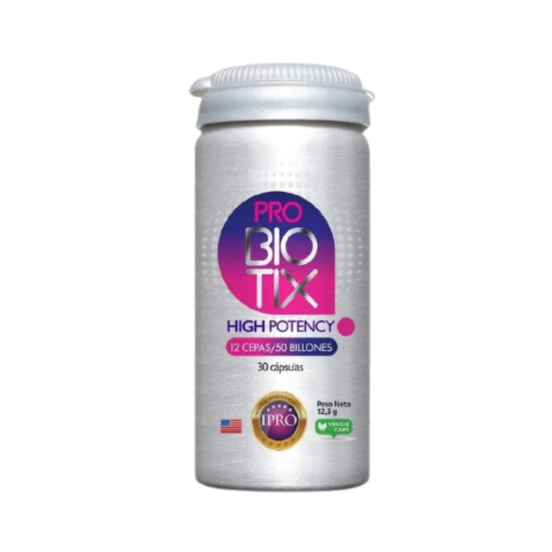 ProBiotix High Potency es un probiótico multicepa que contiene 12 cepas identificadas y respaldadas en sus efectos benéficos en 50 billones de Unidades Formadoras de Colonias (UFC). Diseñado para reponer rápidamente las bacterias beneficiosas en todo el tracto gastrointestinal. Contribuye a mantener el equilibrio de la flora intestinal y regular el tránsito intestinal.